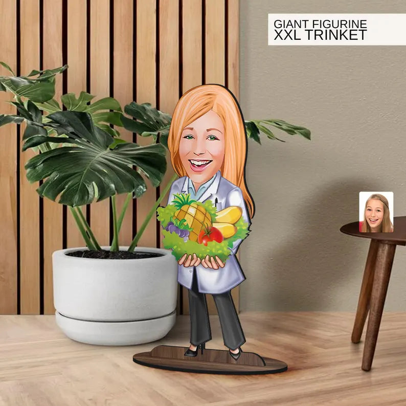 Personalized 3D Wooden Cartoon Nutritionist Oversized Figurine Trinket, Custom Caricature Portrait, Gift for Her, Home Decor, Doctor Gift