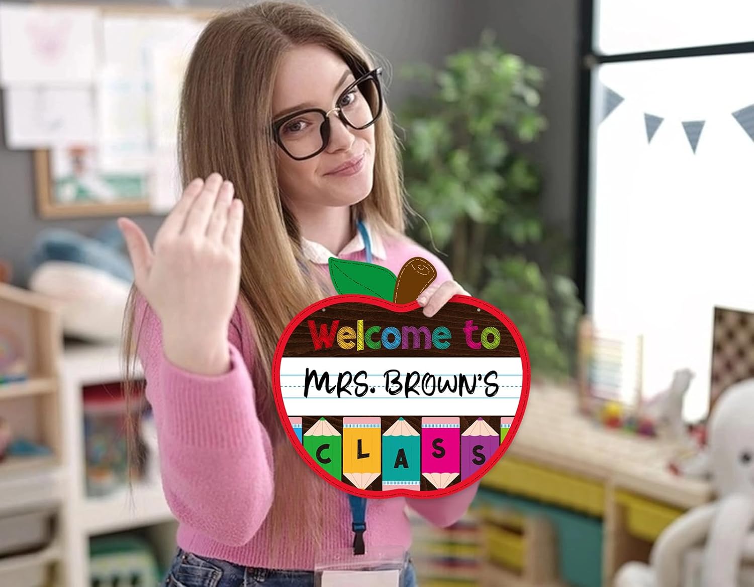 Welcome Sign for Classroom Door Decorations 11.3"x12" Personalized Apple-shape Teacher Door Sign Back to School Welcome to Our Classroom Sign Teacher Name Sign for Classroom Door Teacher Supplies